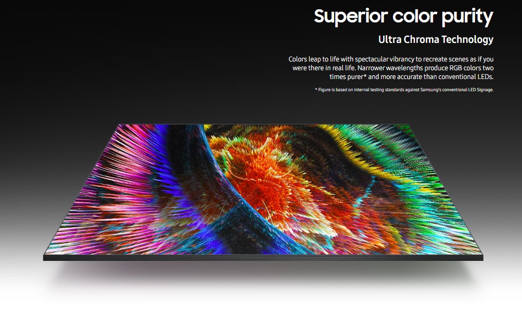Complementing its deep blacks, the display features Ultra Chroma Technology. This innovation narrows the electromagnetic wavelengths of RGB output, producing colours that are significantly purer and more accurate than conventional LED displays. The result is a broader colour gamut and richer visuals that contribute to true‑to‑life content reproduction — particularly impactful for branding, retail displays, and immersive visual experiences.